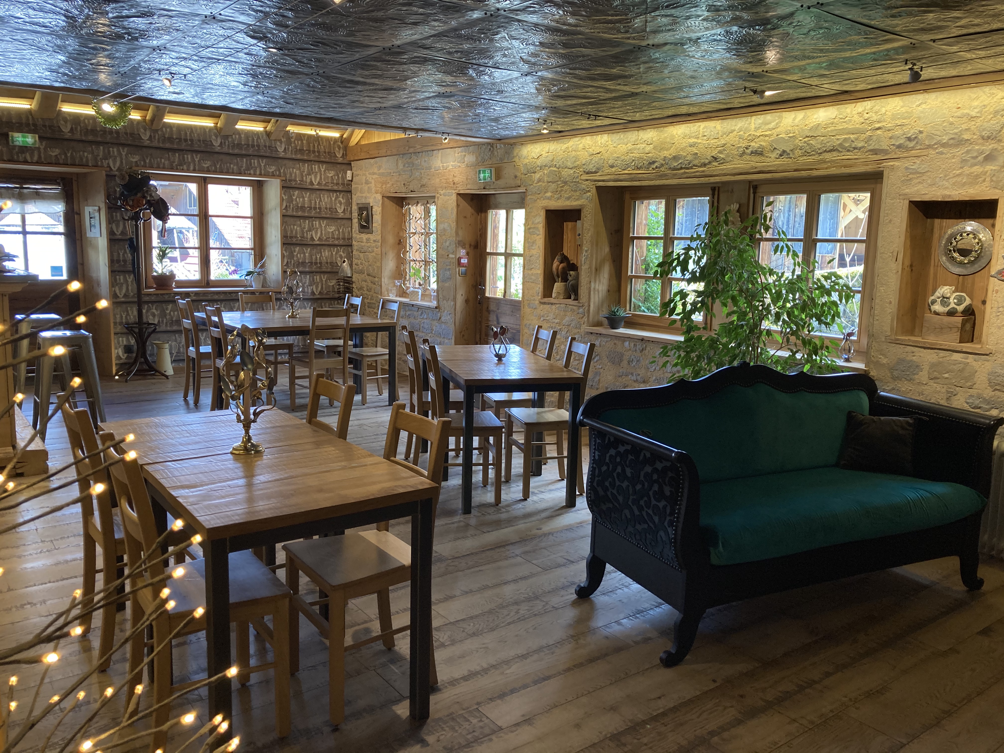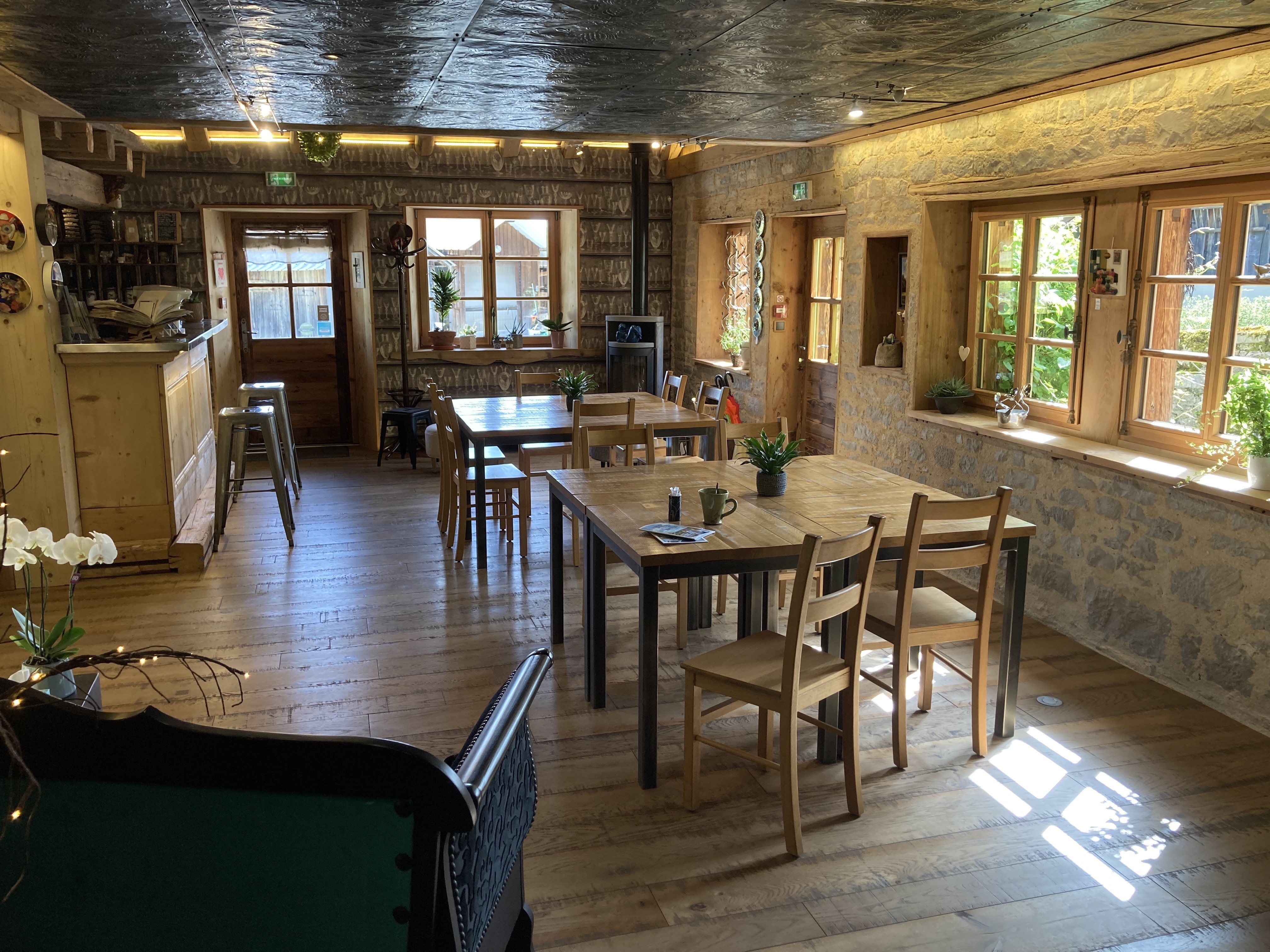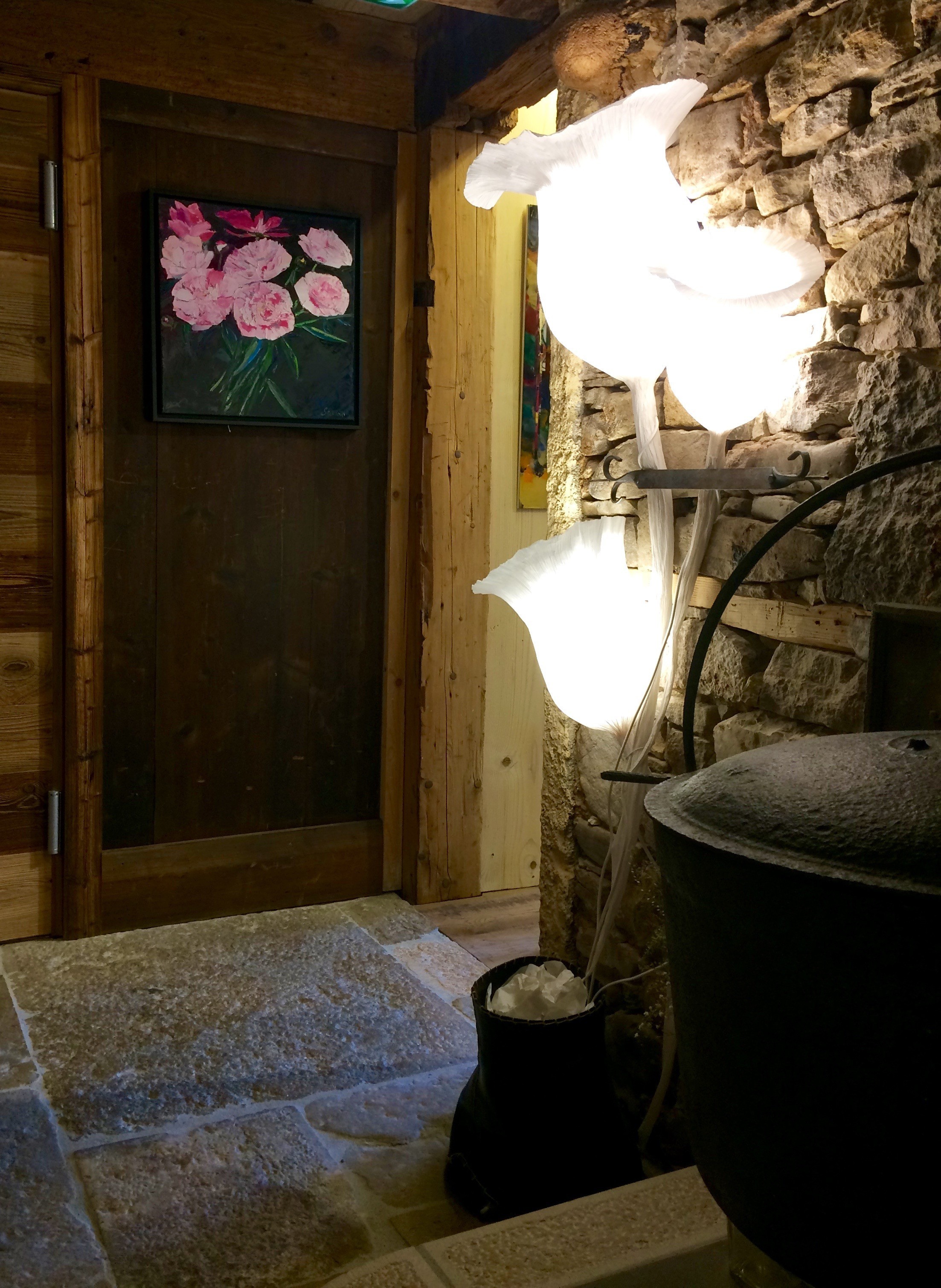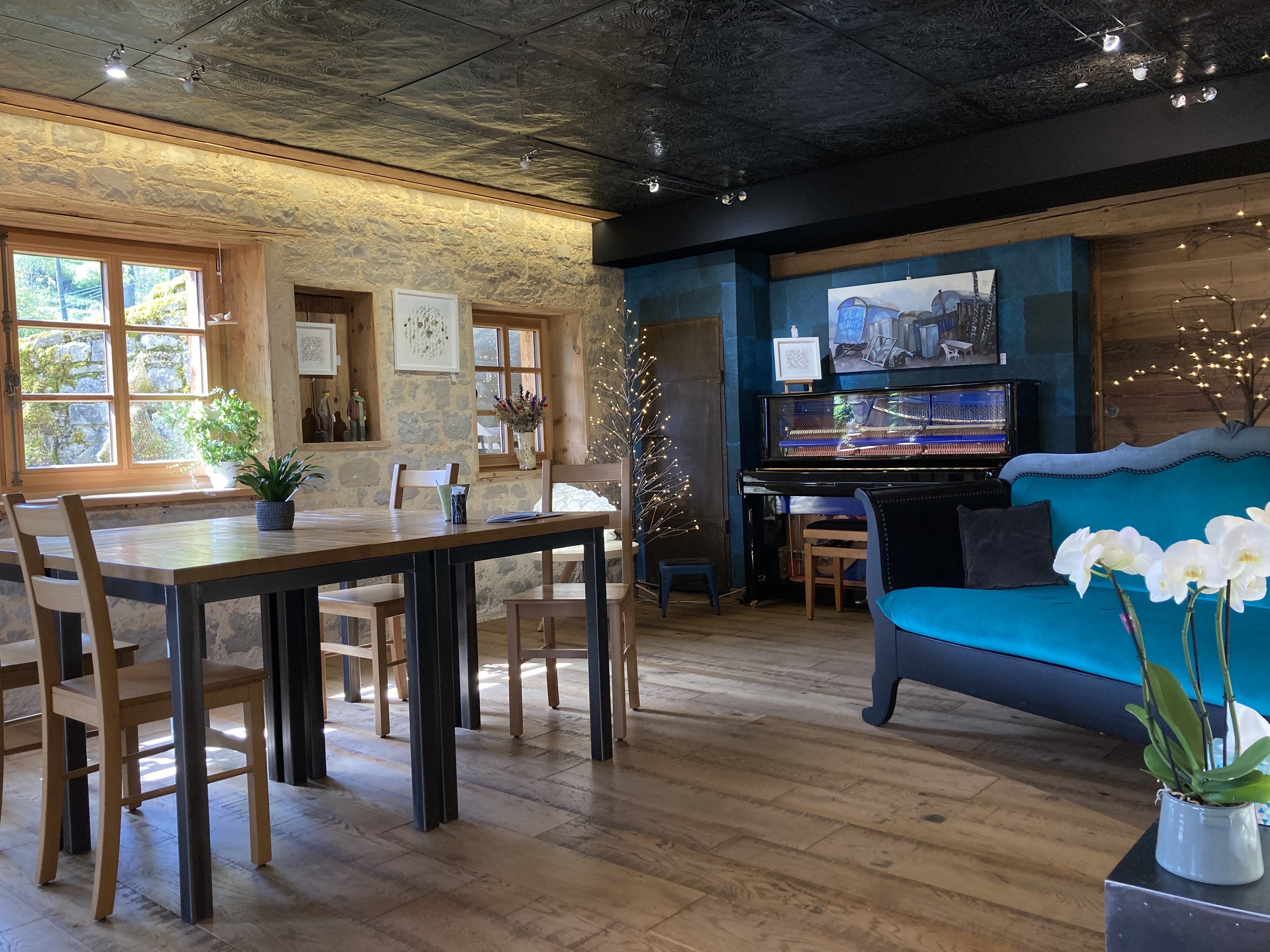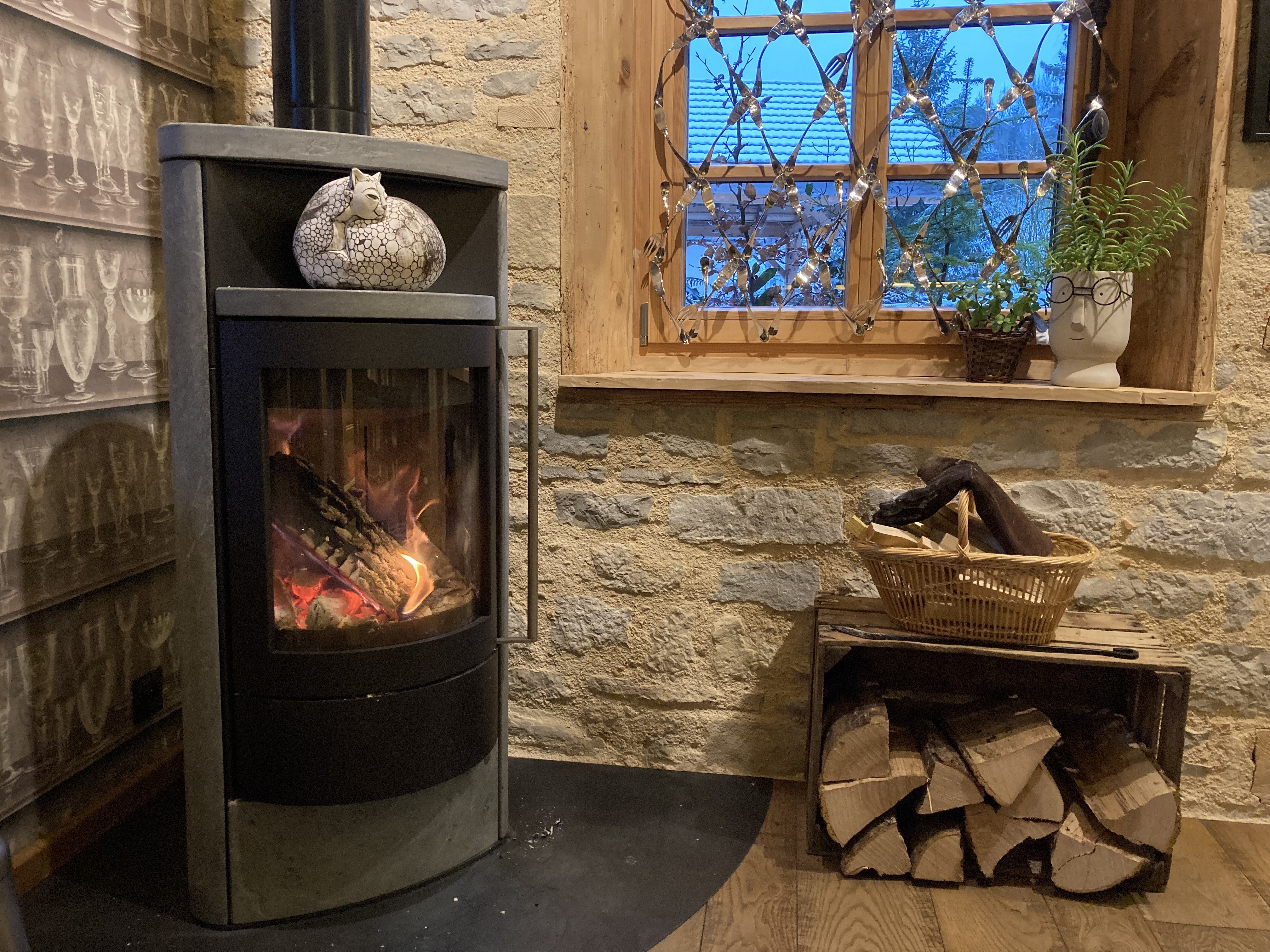 Nous avons fait le choix d’allier authenticité et modernité. Le tuyé a été restauré et a repris sa véritable place au coeur de la maison, comme autrefois. Les pièces ont été rénovées tout en conservant au mieux les éléments originaux (dalles et murs en pierre, enduits