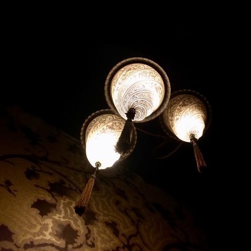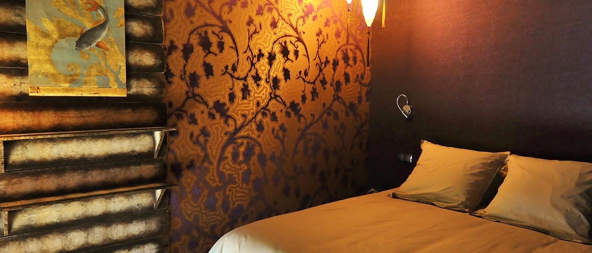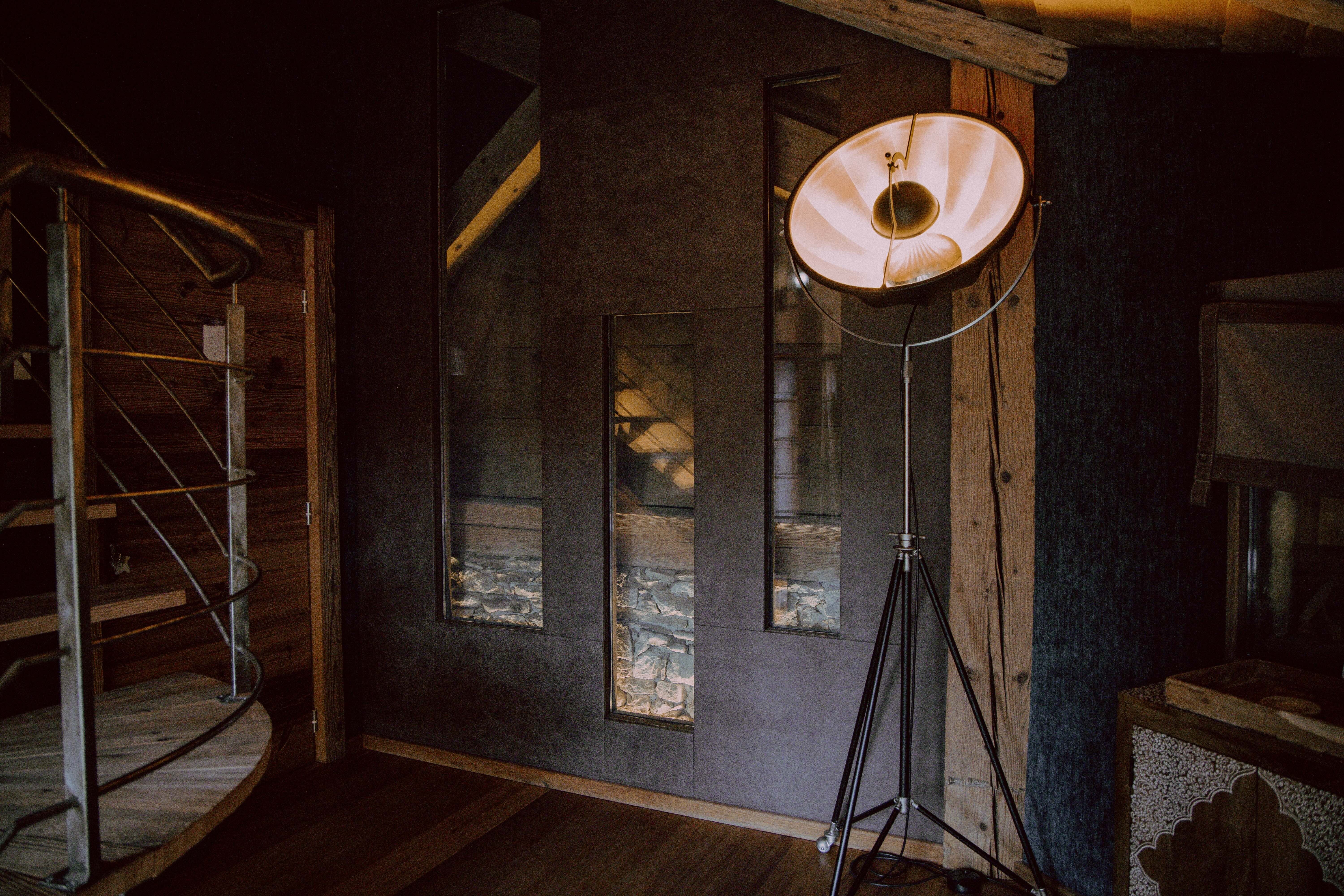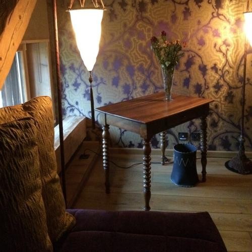 Avec ses deux niveaux, la Chambre Haute de l'Arbre à Chapeaux est un cocon idéal pour une escapade en amoureux ou un séjour plus long. Au rez de cette pièce, les ouvertures sur le tuyé permettent d'en visualiser l'architecture étonnante. L'escalier conduit dans un autre lieu à un autre temps. Laissez-vous emporter par la lumière intime des lampes de Murano dont Mariano Fortuny a dessiné les volutes et entrez dans les contes des Mille et une nuits...