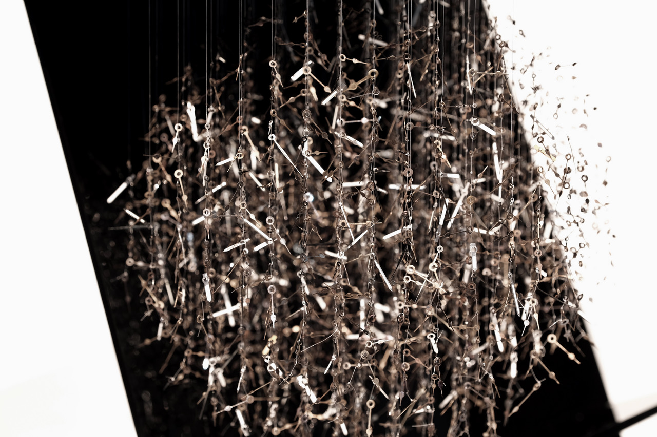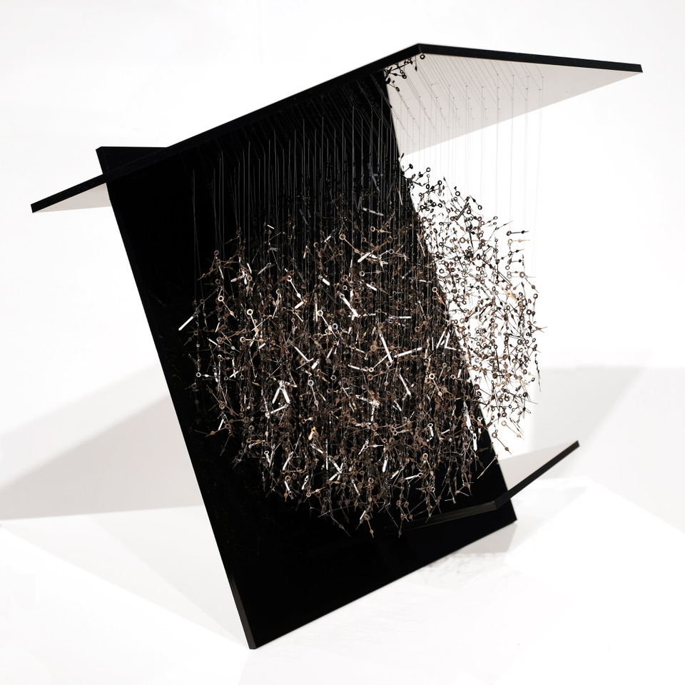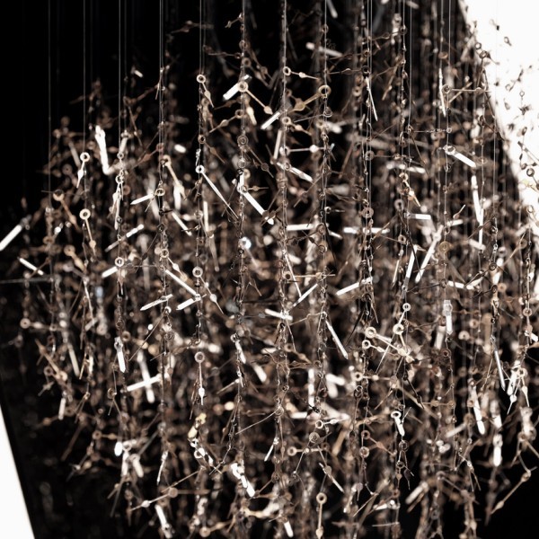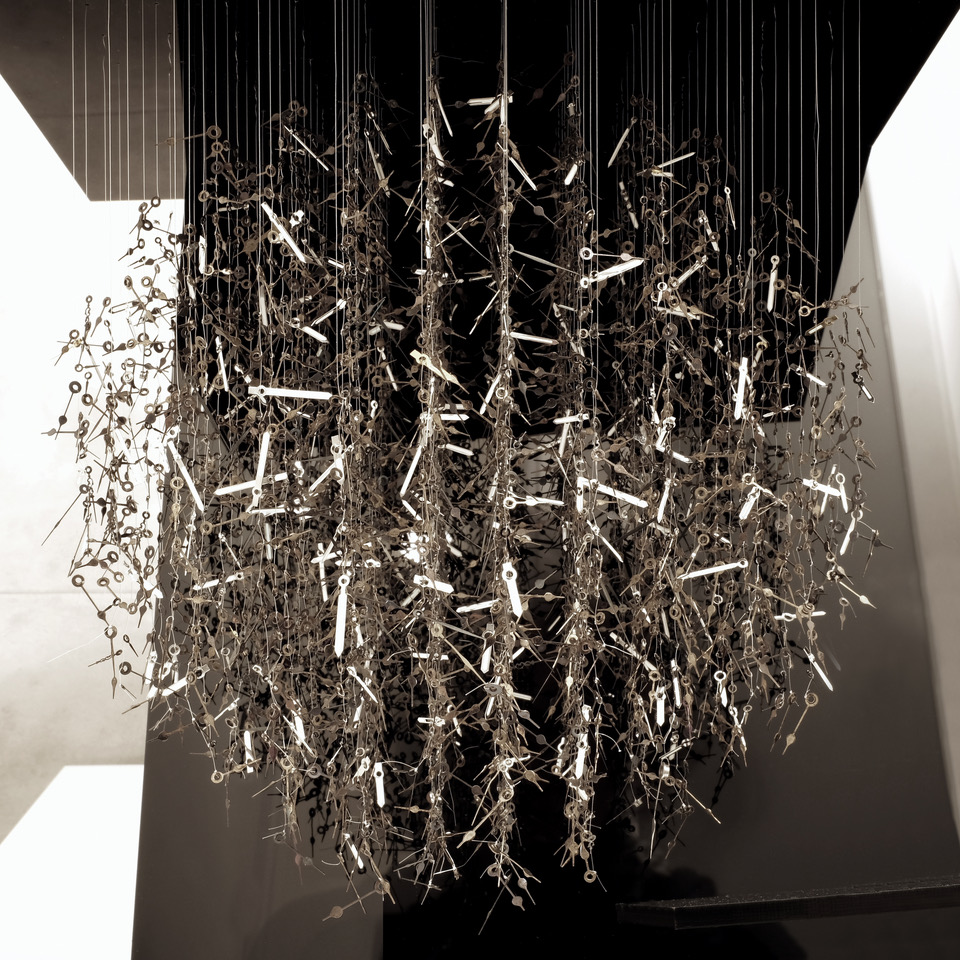 "Sculpteure, je noue le long de fils suspendus des milliers de composants horlogers extraits de leur système. Ils sont libres de leurs mouvements. Chaque composition est réalisée selon une trame de 7, 12, 24, 52, 60 ou 365 fils, répondants aux cycles du temps universel.